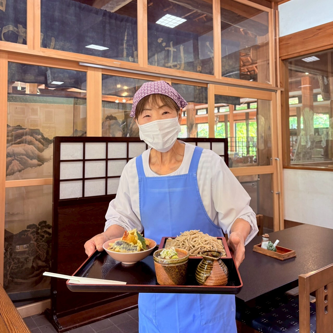 そばを持ってきたところを撮影させてもらおうとすると