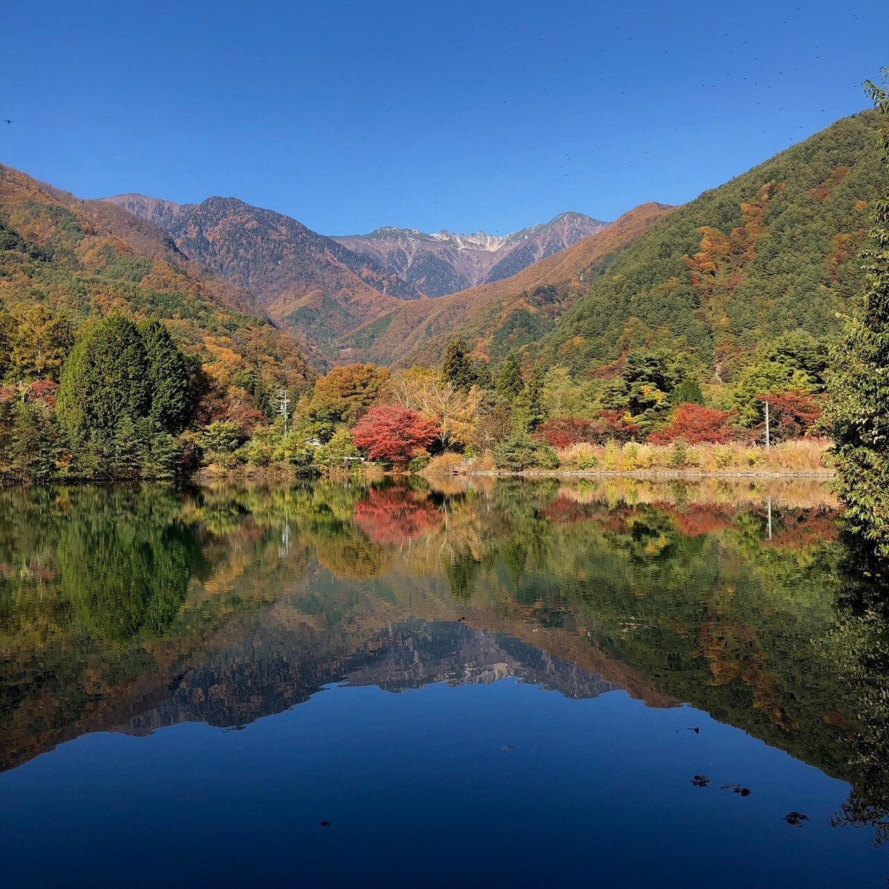 静かな水面に、赤や黄の木々が映り込む駒ヶ根高原・駒ヶ池