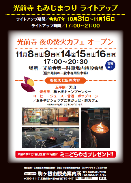 霊犬早太郎伝説としだれ桜の「宝積山 光前寺」では、紅葉の見頃に合わせて境内をライトアップします。昼とは異なる幻想的な風景をぜひお楽しみください。さらに、11月8日、9日、そして14日、15日、16日には、ゆらめく焚火のそばで心地よい時間を過ごしながら、温かな飲み物をご堪能いただける『夜の焚火カフェ』をオープンします。紅葉とともに心癒されるひとときをお過ごしくださいませ。